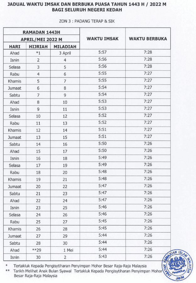 Jadual Waktu Imsak Dan Berbuka Puasa Bagi Negeri Kedah 1442h 2021m